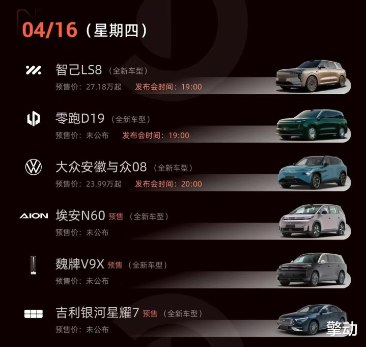 4月同样不遑多让,仅前10天,就有近20款新车完成上市、预售或发布,随着北京车展的临近新车攻势愈演愈烈,以4月16日为例,就有智己LS8、零跑D19、大众安徽与众08、埃安N60、魏牌V9X、吉利银河星耀7等6款新车的预售或上市。