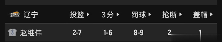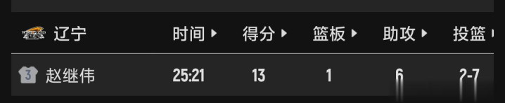 本场比赛,赵继伟上场25分21秒,拿下13分1篮板6助攻,投篮7中2,命中率只有28.57%,三分球六中1,罚球9个中八8个,有两个抢断和一个盖帽。