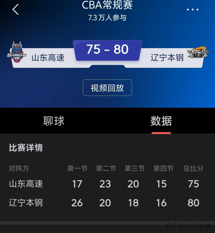 第三节山东男篮高诗岩和外援珀塞尔,琼斯开局就打出10-0的优势,最后60比64,辽宁落后4分。决胜局,王岚嵚,姜宇星开始为辽篮发力,山东男篮这边的许梦君,珀塞尔则是利用3分追至比分只差两分。在最后两分钟,赵继伟关键两罚全中,反超比分,最终,辽宁80比75战胜山东。