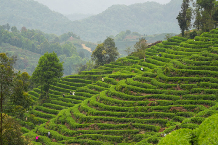 4月5日,人们在四川省雅安市牛碾坪万亩观光茶园体验采茶。新华社记者胥冰洁摄