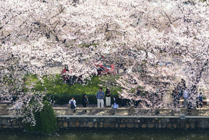4月5日,人们在江苏省常熟市的护城河畔赏花(无人机照片)。新华社发(杨素平摄)