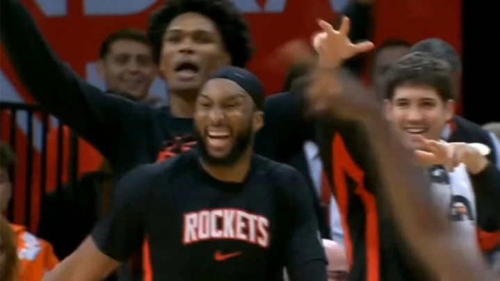 投进这一球后,卡佩拉展开双臂庆祝,火箭替补席也仿佛过年般开心。
